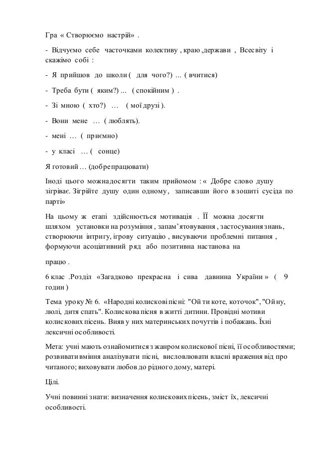 - 7. Гра « Створюємо настрій» . - Відчуємо себе часточками колективу , краю ,держави , Всесвіту і скажімо собі : - Я прийшов до школи ( для чого?) ... ( вчитися) - Треба бути ( яким?) ... ( спокійним ) . - Зі мною ( хто?) … ( мої друзі ). - Вони мене … ( люблять). - мені … ( приємно) - у класі … ( сонце) Я готовий … (добре працювати) Іноді цього можна досягти таким прийомом : « Добре слово душу зігріває. Зігрійте душу один одному , записавши його в зошиті сусіда по парті» На цьому ж етапі здійснюється мотивація . ЇЇ можна досягти шляхом установки на розуміння , запам’ятовування , застосування знань, створюючи інтригу, ігрову ситуацію , висуваючи проблемні питання , формуючи асоціативний ряд або позитивна настанова на працю . 6 клас .Розділ «Загадково прекрасна і сива давнина України » ( 9 годин ) Тема уроку № 6. «Народні колискові пісні: "Ой ти коте, коточок", "Ой ну, люлі, дитя спать". Колискова пісня в житті дитини. Провідні мотиви колискових пісень. Вияв у них материнських почуттів і побажань. Їхні лексичні особливості. Мета: учні мають ознайомитися з жанром колискової пісні, її особливостями; розвивати вміння аналізувати пісні, висловлювати власні враження від про читаного; виховувати любов до рідного дому, матері. Цілі. Учні повинні знати: визначення колискових пісень, зміст їх, лексичні особливості.